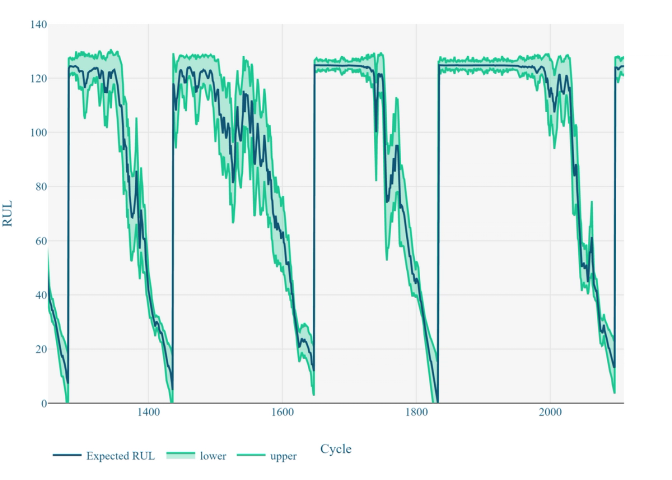 The model achieves an average percentage error of ~10%. From Figure 3 we can see that the model often predicts with low uncertainty around the turbine’s initial life span. This justifies the piecewise linear assumption. If this degradation model was not a good fit, we would expect to see high uncertainty around the early system life in particular, as well as an overall higher MAE. This would be due to the model being unable to relate a discovered degradation signal in the sensor data to an unchanging RUL label.